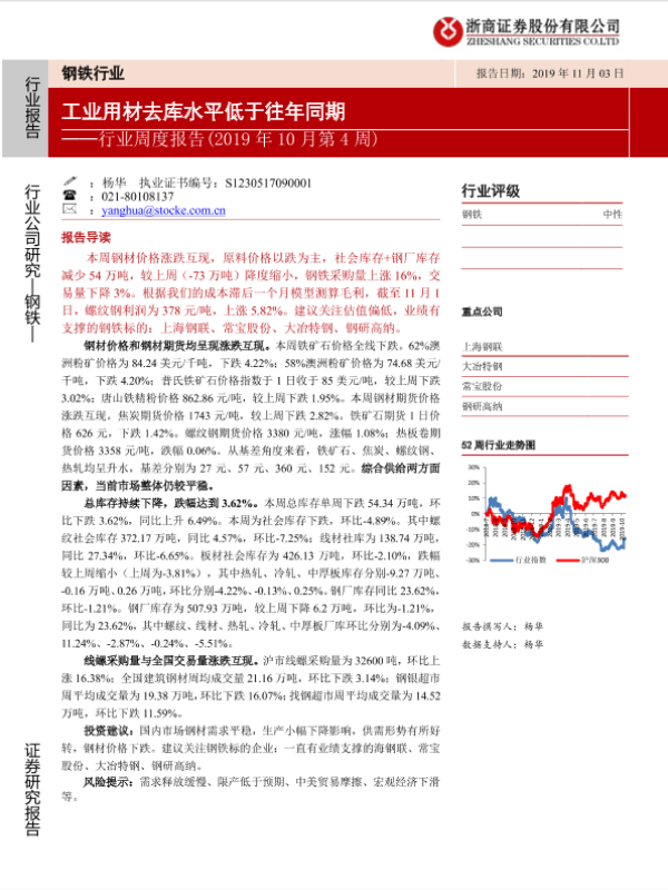 【浙商证券】【20191103】2019年10月第4周钢铁行业周度报告:工业用材去库水平低于往年同期-16页