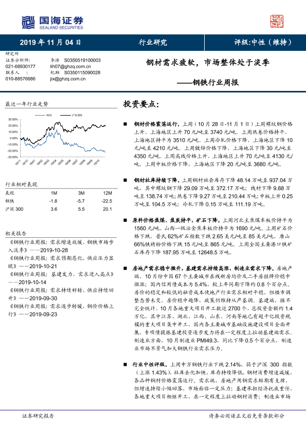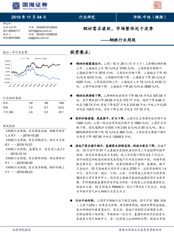 【国海证券】【20191104】20191104-国海证券-钢铁行业周报:钢材需求疲软,市场整体处于淡季-15页