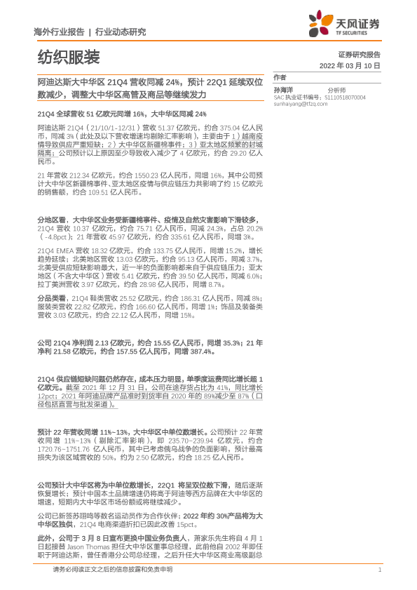 【天风证券】【20220310】纺织服装:阿迪达斯大中华区21Q4营收同减24%,预计22Q1延续双位数减少,调整大中华区高管及商品等继续发力-3页