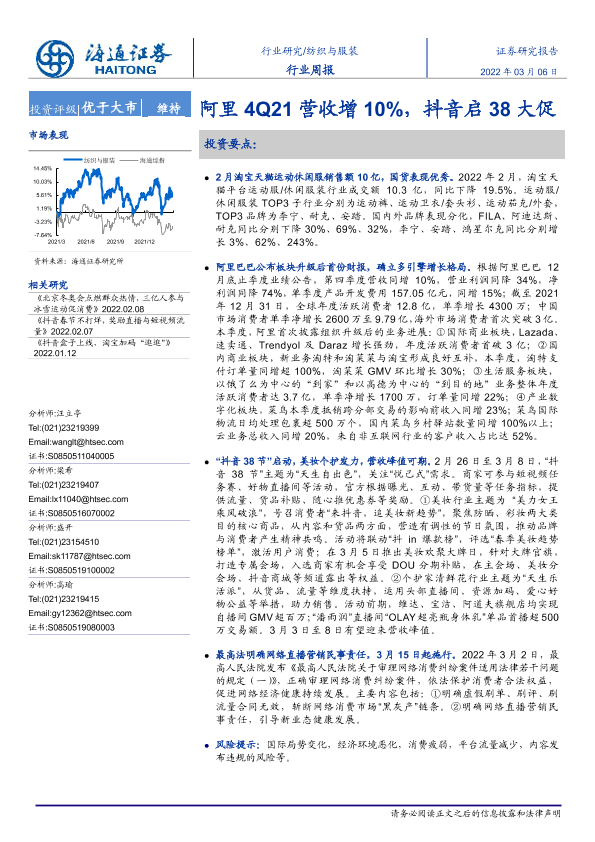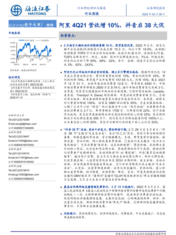 【海通证券】【20220306】20220306-海通证券-纺织与服装行业周报:阿里4Q21营收增10%,抖音启38大促-10页