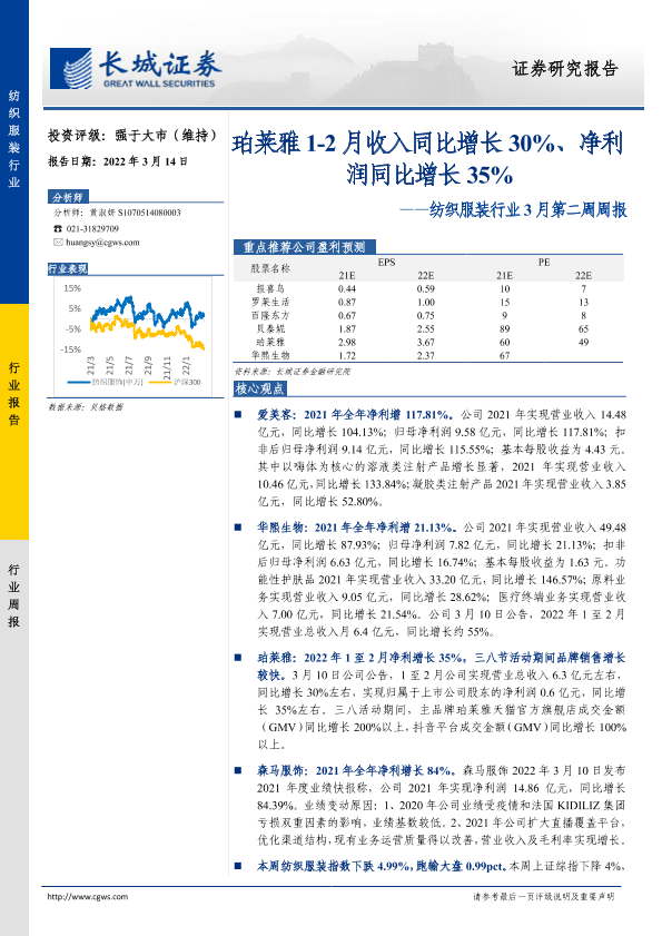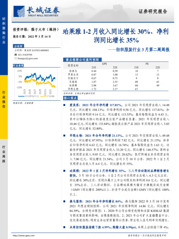 【长城证券】【20220314】20220314-长城证券-纺织服装行业3月第二周周报:珀莱雅1-2月收入同比增长30%、净利润同比增长35%-12页