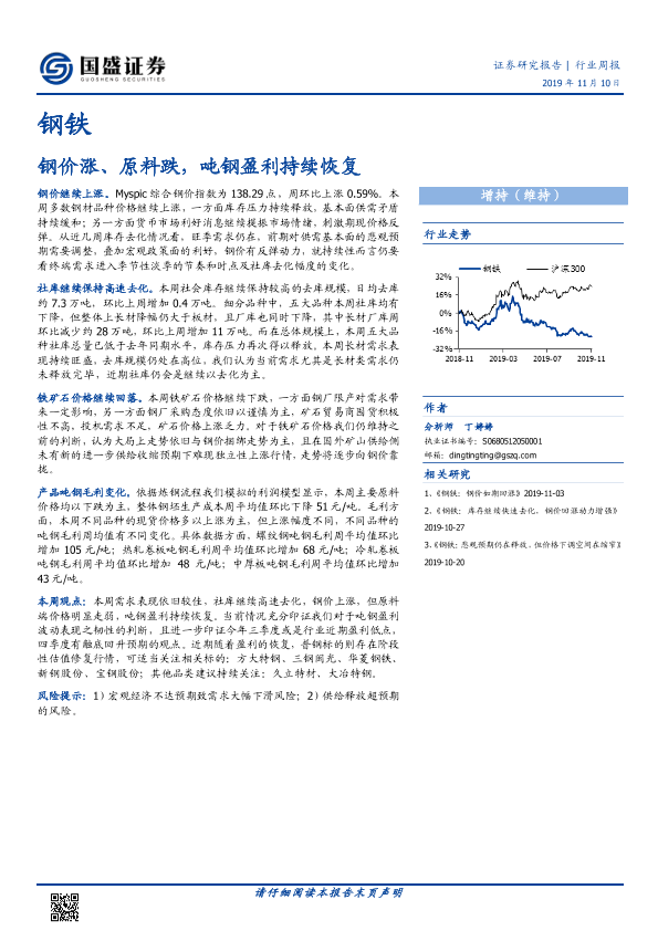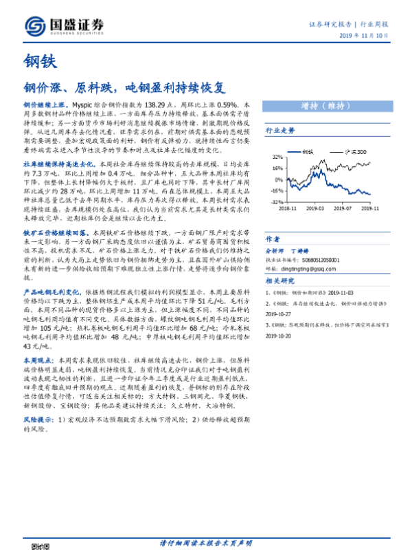 【国盛证券】【20191110】20191110-国盛证券-钢铁行业周报:钢价涨、原料跌,吨钢盈利持续恢复-10页