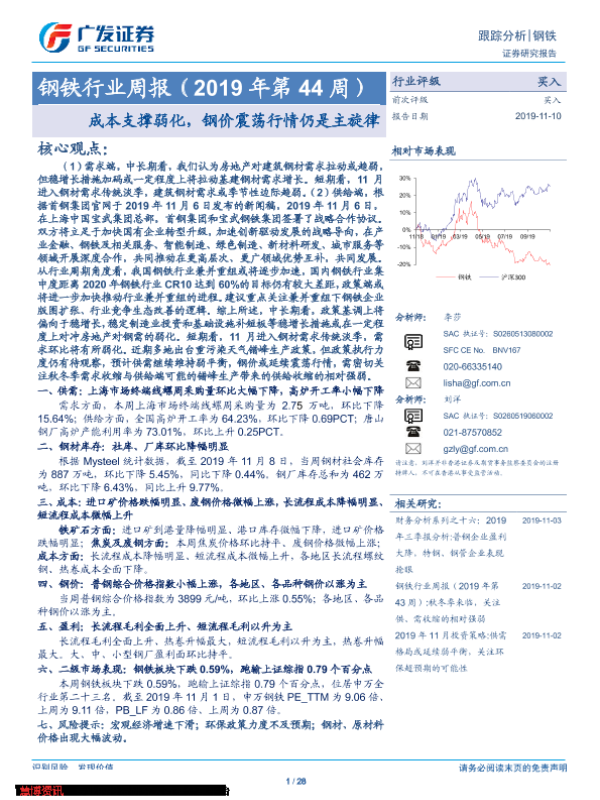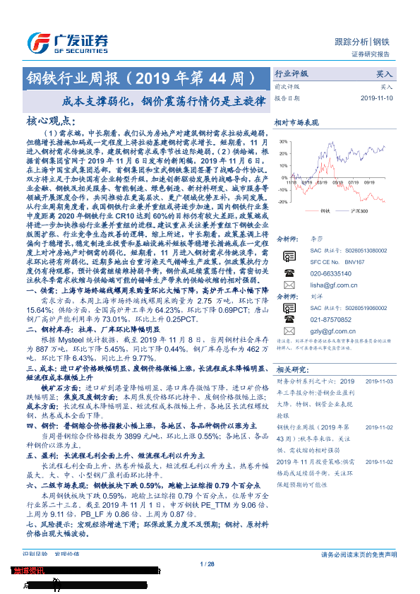 【广发证券】【20191110】20191110-广发证券-钢铁行业周报(2019年第44周):成本支撑弱化,钢价震荡行情仍是主旋律-28页
