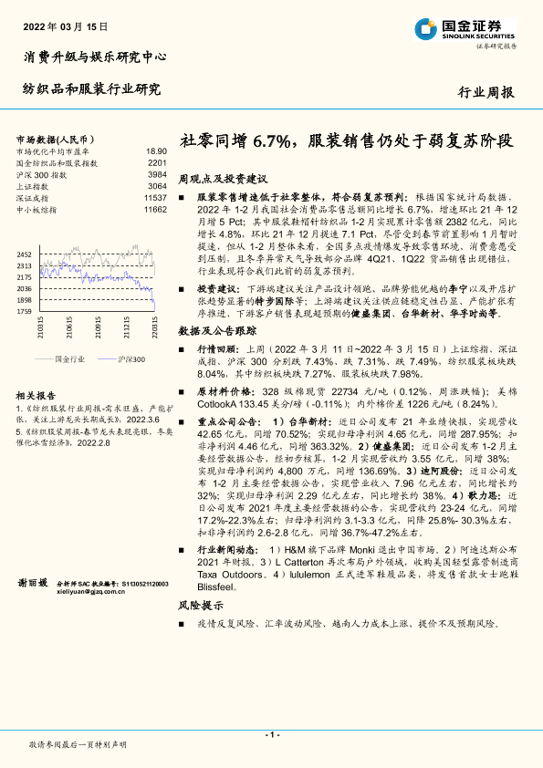 【国金证券】【20220315】20220315-国金证券-纺织品和服装行业研究:社零同增6.7%,服装销售仍处于弱复苏阶段-14页