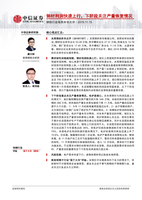 【中信证券】【20191115】20191115-中信证券-钢铁行业每周库存点评:钢材利润快速上行,下阶段关注产量恢复情况-3页