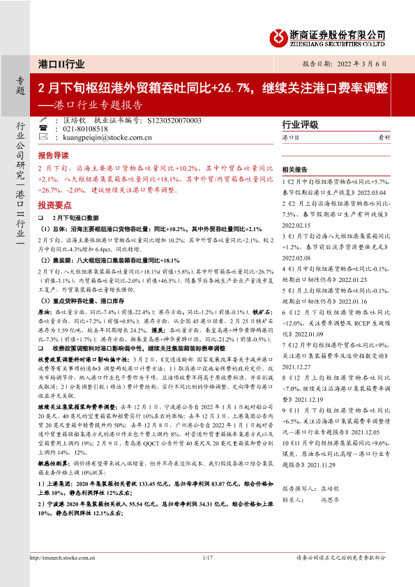 【浙商证券】【20220306】港口行业专题报告:2月下旬枢纽港外贸箱吞吐同比+26.7%,继续关注港口费率调整-17页