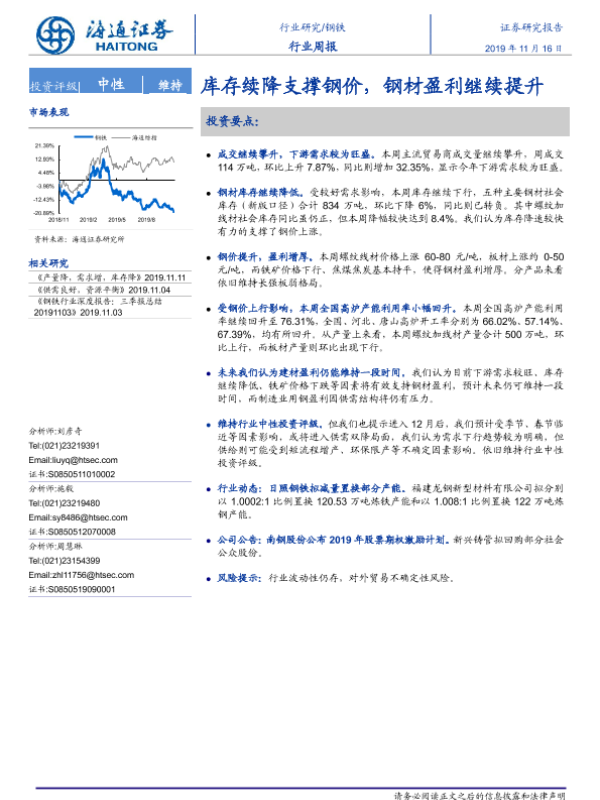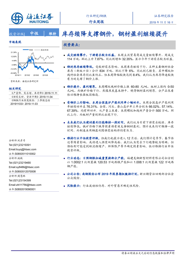 【海通证券】【20191116】20191116-海通证券-钢铁行业周报:库存续降支撑钢价,钢材盈利继续提升-14页