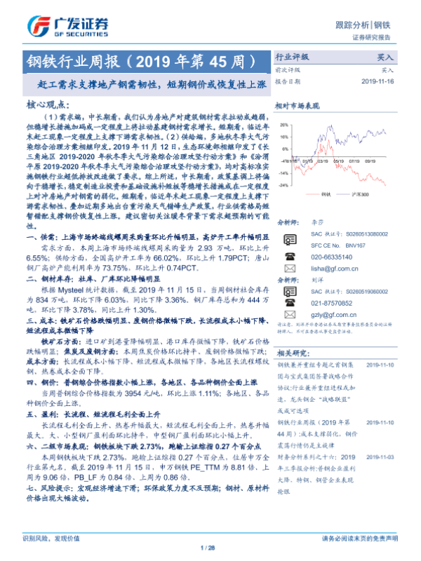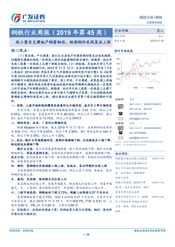 【广发证券】【20191116】2019年第45周钢铁行业周报:赶工需求支撑地产钢需韧性,短期钢价或恢复性上涨-28页