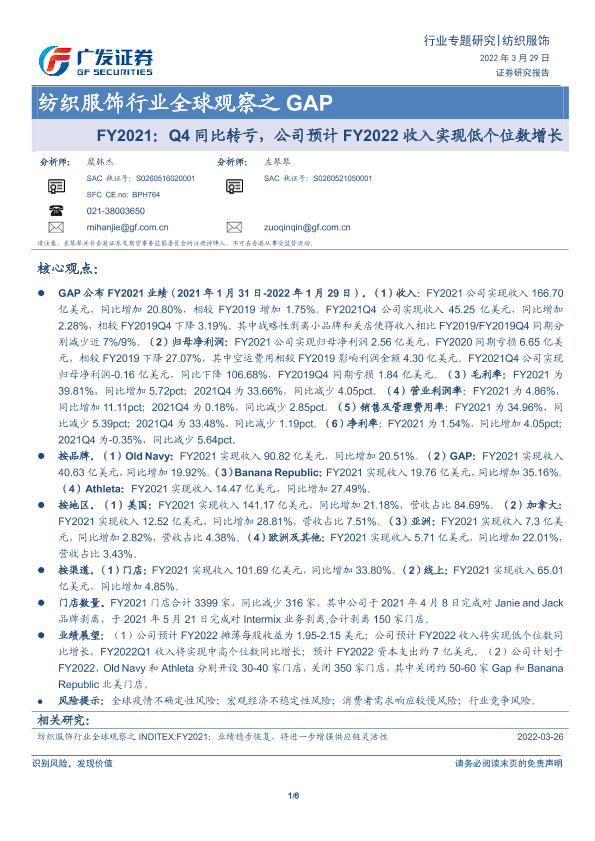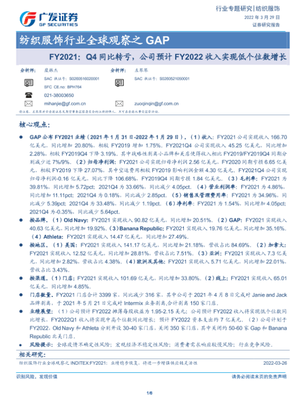 【广发证券】【20220329】纺织服饰行业全球观察之GAP:FY2021:Q4同比转亏,公司预计FY2022收入实现低个位数增长-6页