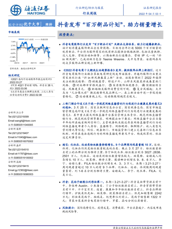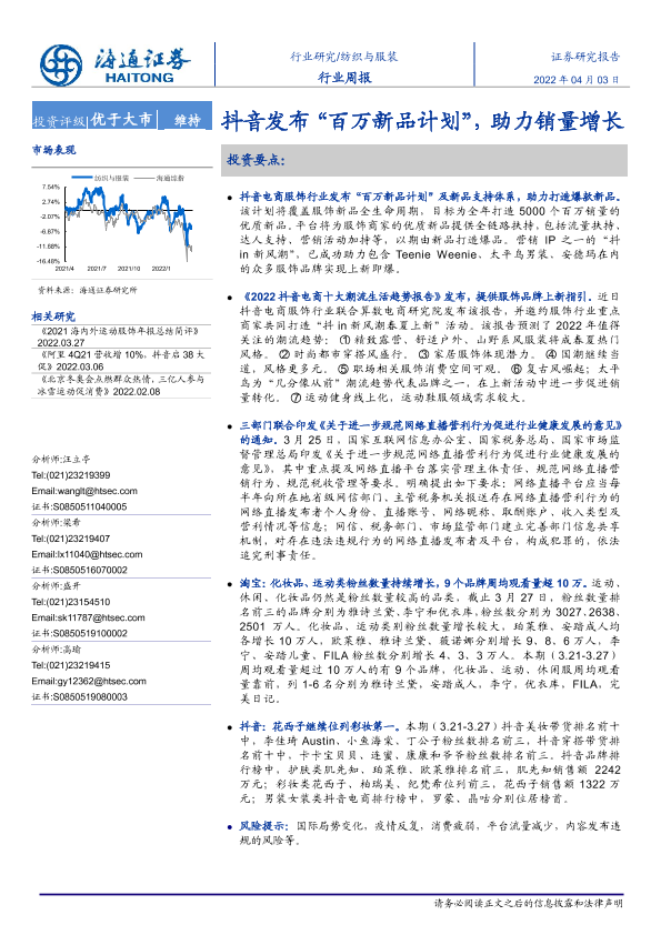 【海通证券】【20220403】20220403-海通证券-纺织与服装行业周报:抖音发布“百万新品计划”,助力销量增长-10页