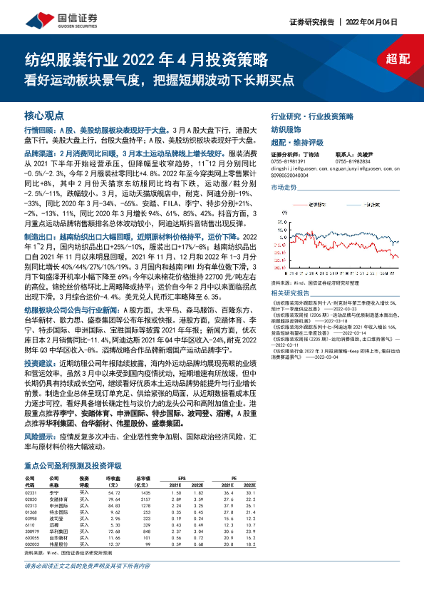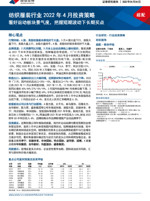 【国信证券】【20220404】纺织服装行业2022年4月投资策略:看好运动板块景气度,把握短期波动下长期买点-24页