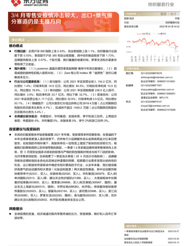 【东方证券】【20220404】20220404-东方证券-纺织服装行业周报:3 4月零售受疫情冲击较大,出口+景气细分赛道仍是主推方向-8页