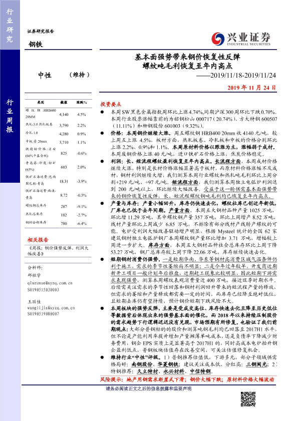 【兴业证券】【20191124】基本面强势带来钢价恢复性反弹 螺纹吨毛利恢复至年内高点-17页