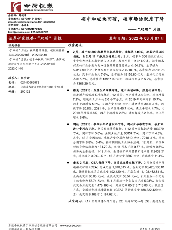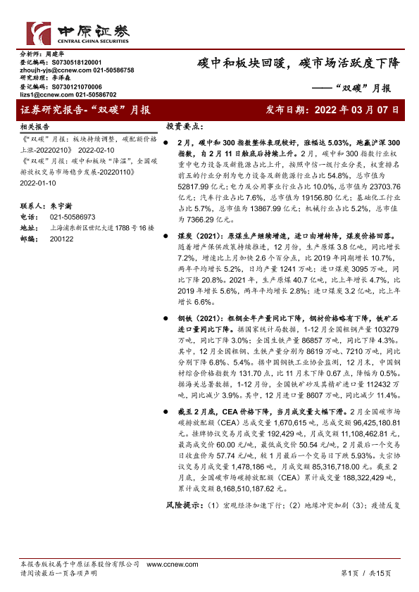 【中原证券】【20220307】环保行业“双碳”月报:碳中和板块回暖,碳市场活跃度下降-15页