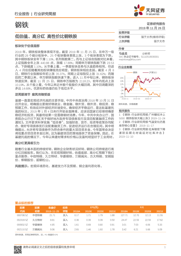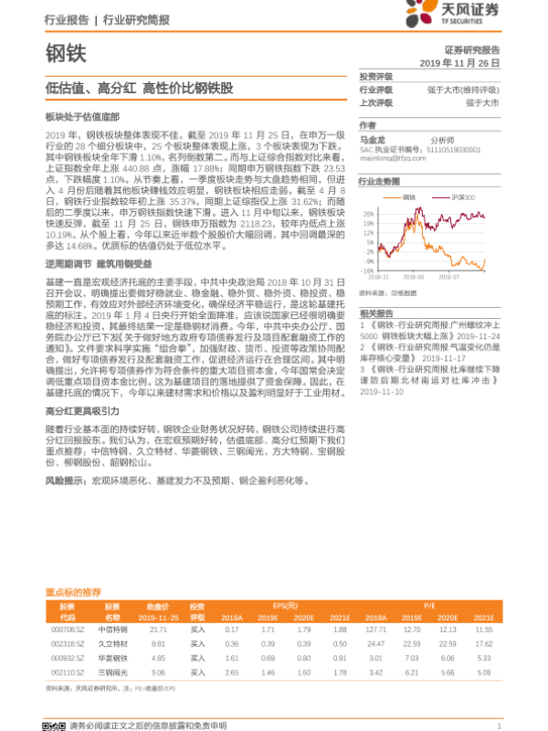 【天风证券】【20191126】钢铁:低估值、高分红 高性价比钢铁股-7页
