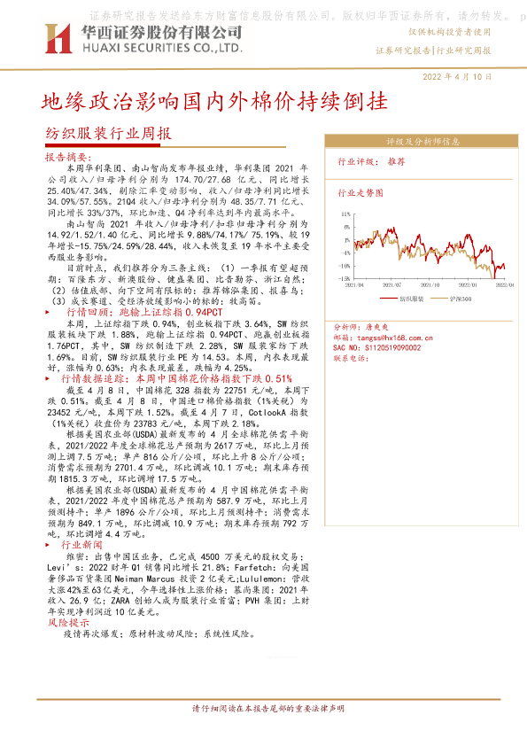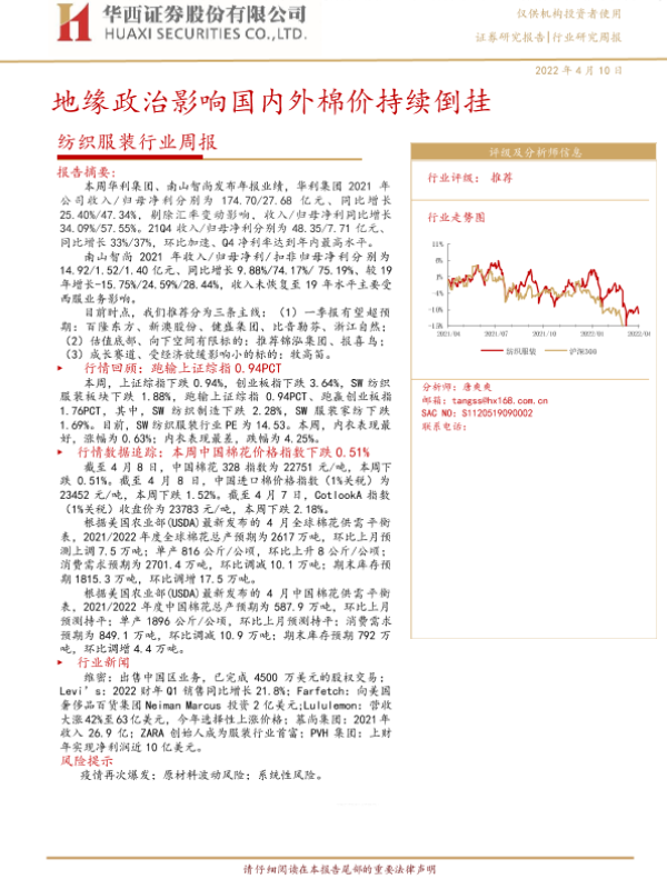 【华西证券】【20220410】纺织服装行业周报:地缘政治影响国内外棉价持续倒挂-18页