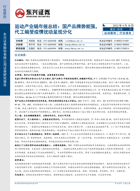 【东兴证券】【20220418】20220418-东兴证券-运动产业链年报总结:国产品牌势能强,代工端受疫情扰动呈现分化-13页