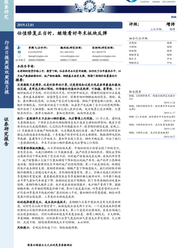 【国泰君安证券】【20191201】钢铁:估值修复正当时,继续看好年末板块反弹-24页