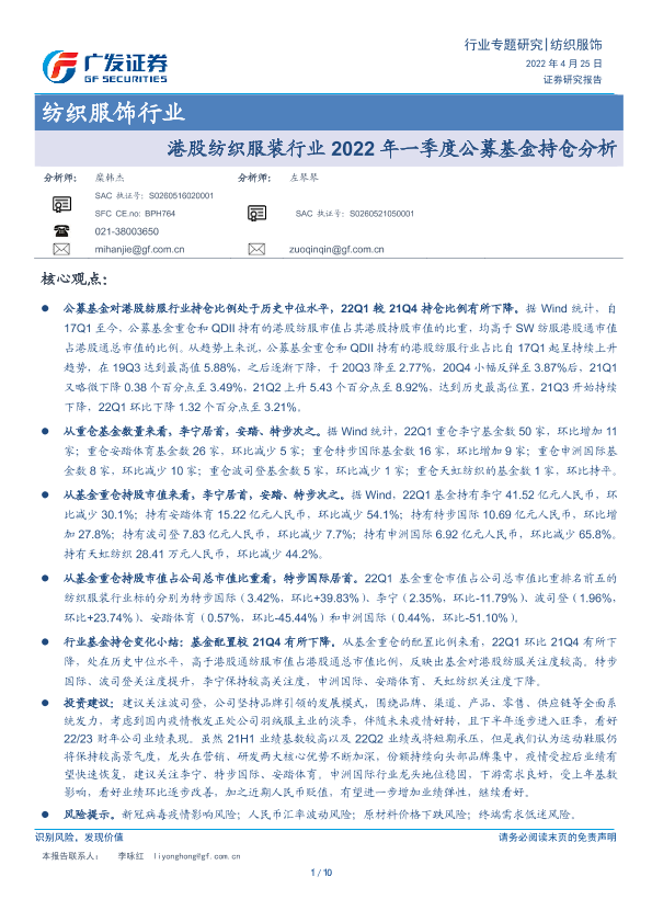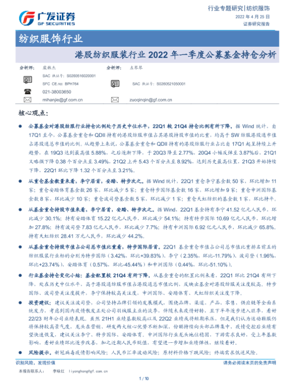 【广发证券】【20220425】港股纺织服装行业2022年一季度公募基金持仓分析-10页