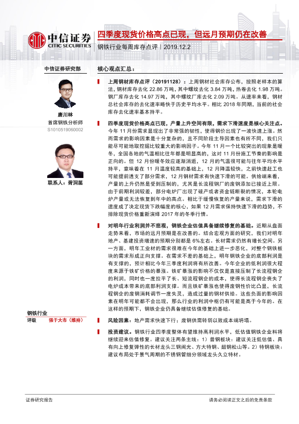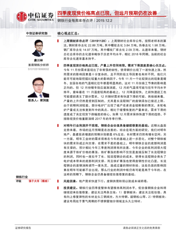 【中信证券】【20191202】钢铁行业每周库存点评:四季度现货价格高点已现,但远月预期仍在改善-3页