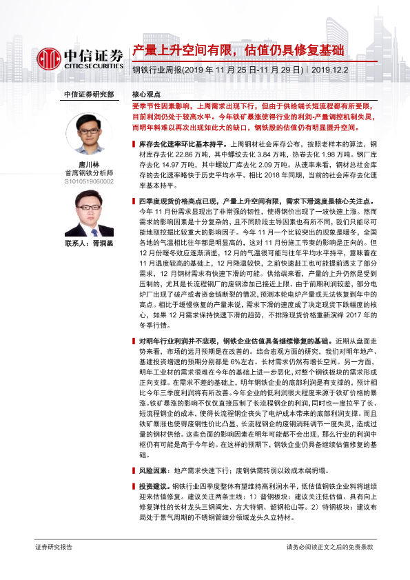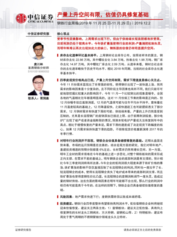 【中信证券】【20191202】钢铁行业周报:产量上升空间有限,估值仍具修复基础-13页