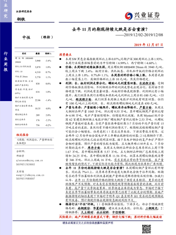 【兴业证券】【20191207】20191207-兴业证券-钢铁行业周报:去年11月的期现持续大跌是否会重演?-17页