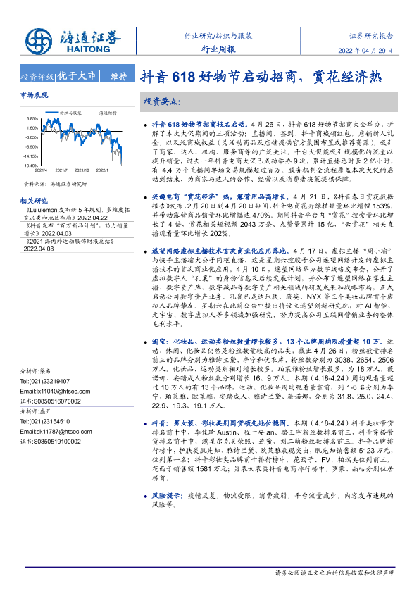 【海通证券】【20220429】20220429-海通证券-纺织与服装行业周报:抖音618好物节启动招商,赏花经济热-9页