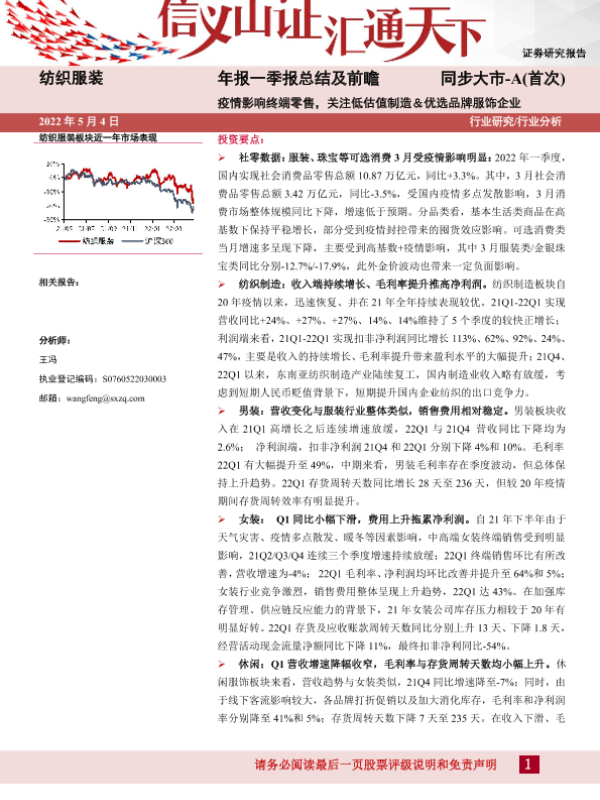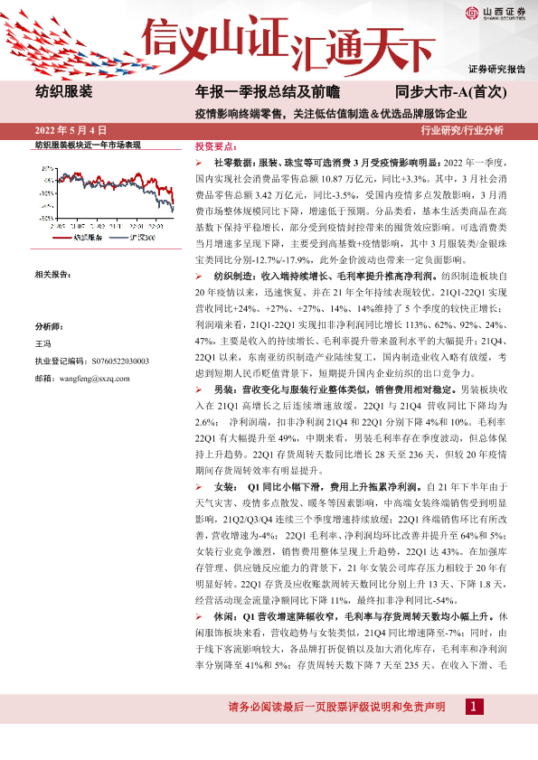 【山西证券】【20220504】20220504-山西证券-纺织服装年报一季报总结及前瞻:疫情影响终端零售,关注低估值制造&优选品牌服饰企业-22页