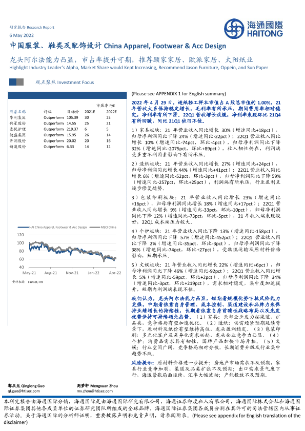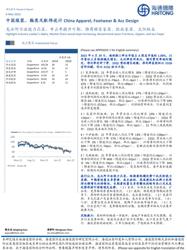 【海通国际】【20220506】中国服装、鞋类及配饰设计:龙头阿尔法能力凸显,市占率提升可期,推荐顾家家居、欧派家居、太阳纸业-19页