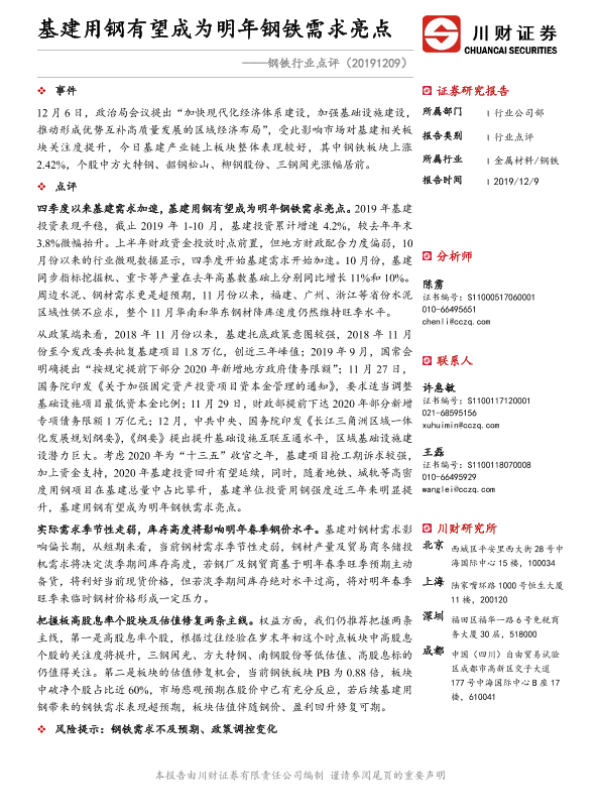 【川财证券】【20191209】钢铁行业点评:基建用钢有望成为明年钢铁需求亮点-2页