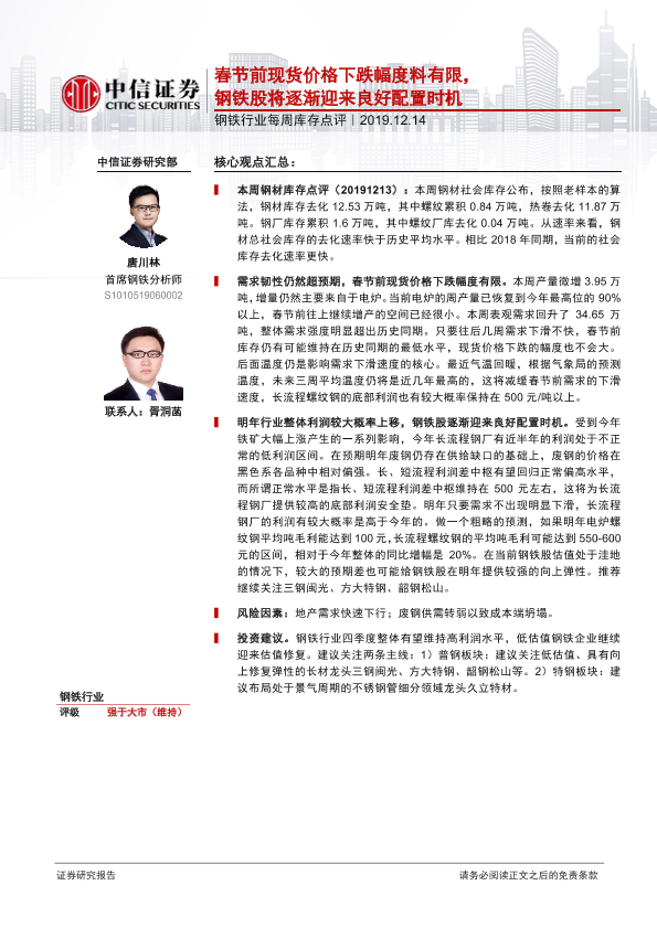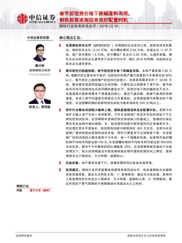 【中信证券】【20191214】20191214-中信证券-钢铁行业每周库存点评:春节前现货价格下跌幅度料有限,钢铁股将逐渐迎来良好配置时机-3页
