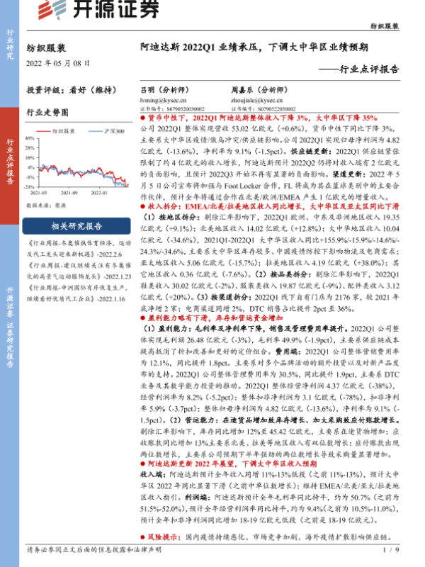 【开源证券】【20220508】20220508-开源证券-纺织服装行业点评报告:阿迪达斯2022Q1业绩承压,下调大中华区业绩预期-9页