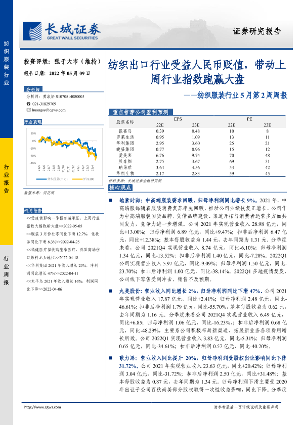 【长城证券】【20220509】纺织服装行业5月第2周周报:纺织出口行业受益人民币贬值,带动上周行业指数跑赢大盘-13页