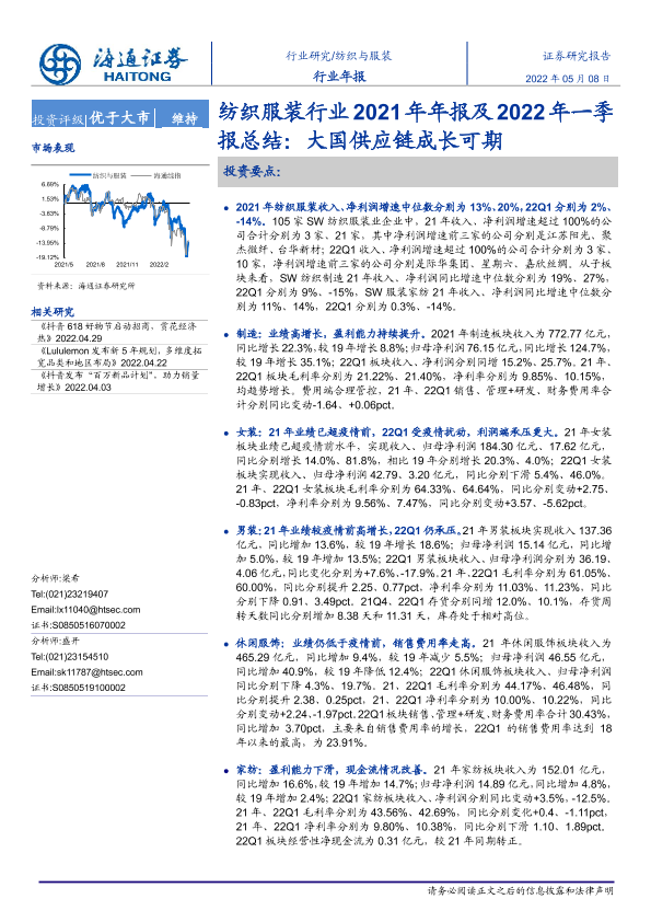 【海通证券】【20220508】纺织服装行业2021年年报及2022年一季报总结:大国供应链成长可期-27页