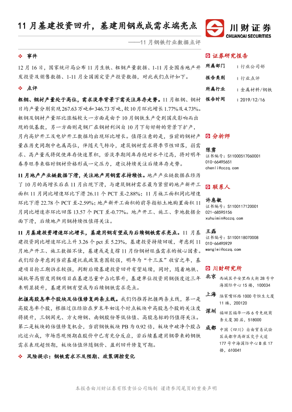 【川财证券】【20191216】11月钢铁行业数据点评:11月基建投资回升,基建用钢或成需求端亮点-2页