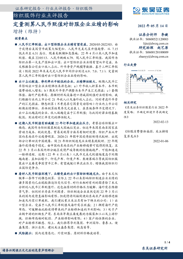 【东吴证券】【20220514】20220514-东吴证券-纺织服饰行业点评报告:定量测算人民币贬值对纺服企业业绩的影响-4页
