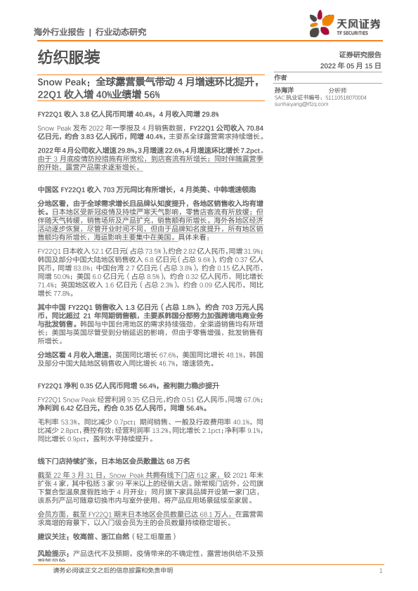 【天风证券】【20220515】纺织服装:Snow Peak:全球露营景气带动4月增速环比提升,22Q1收入增40%业绩增56%-7页