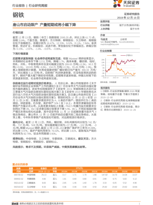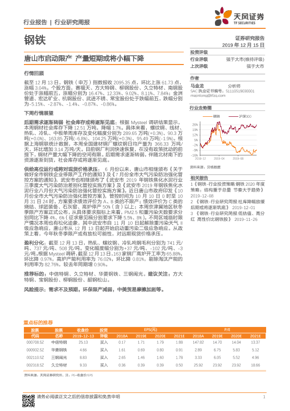 【天风证券】【20191215】20191215-天风证券-钢铁行业研究周报:唐山市启动限产 产量短期或将小幅下降-12页