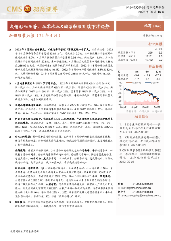 【海通证券】【20220516】纺织服装月报(22年4月):疫情影响显著,社零承压&淘系鞋服延续下滑趋势-10页