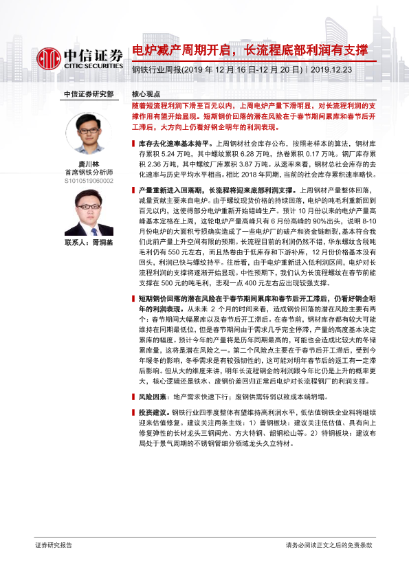【中信证券】【20191223】20191223-中信证券-钢铁行业周报:电炉减产周期开启,长流程底部利润有支撑-13页
