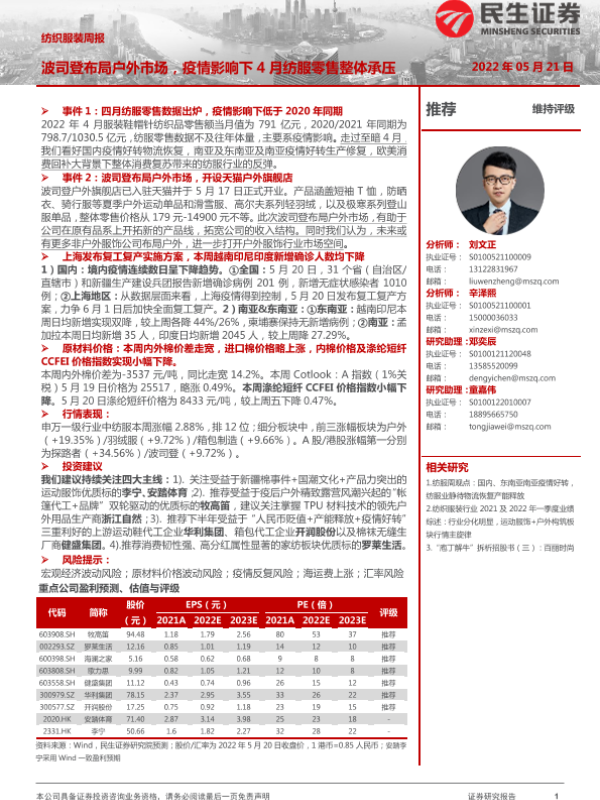 【民生证券】【20220521】20220521-民生证券-纺织服装周报:波司登布局户外市场,疫情影响下4月纺服零售整体承压-23页