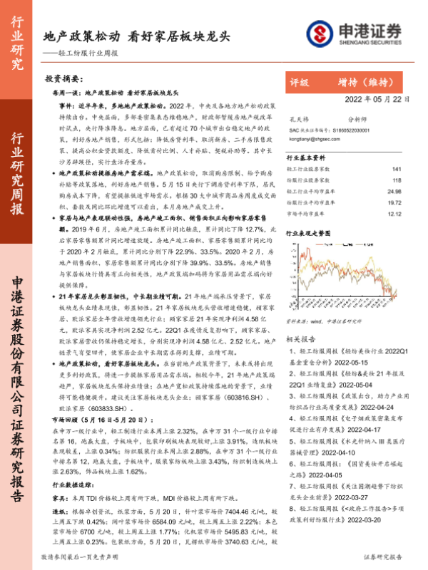 【申港证券】【20220522】20220522-申港证券-轻工纺服行业周报:地产政策松动 看好家居板块龙头-15页