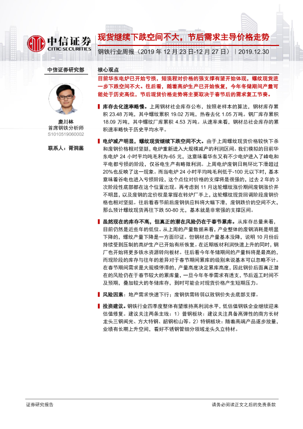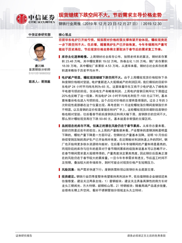 【中信证券】【20191230】20191230-中信证券-钢铁行业周报:现货继续下跌空间不大,节后需求主导价格走势-13页