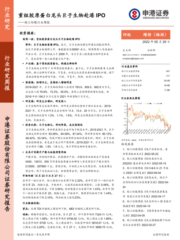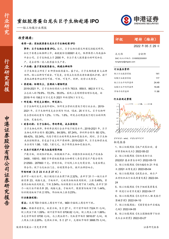 【申港证券】【20220529】轻工纺服行业周报:重组胶原蛋白龙头巨子生物赴港IPO-21页