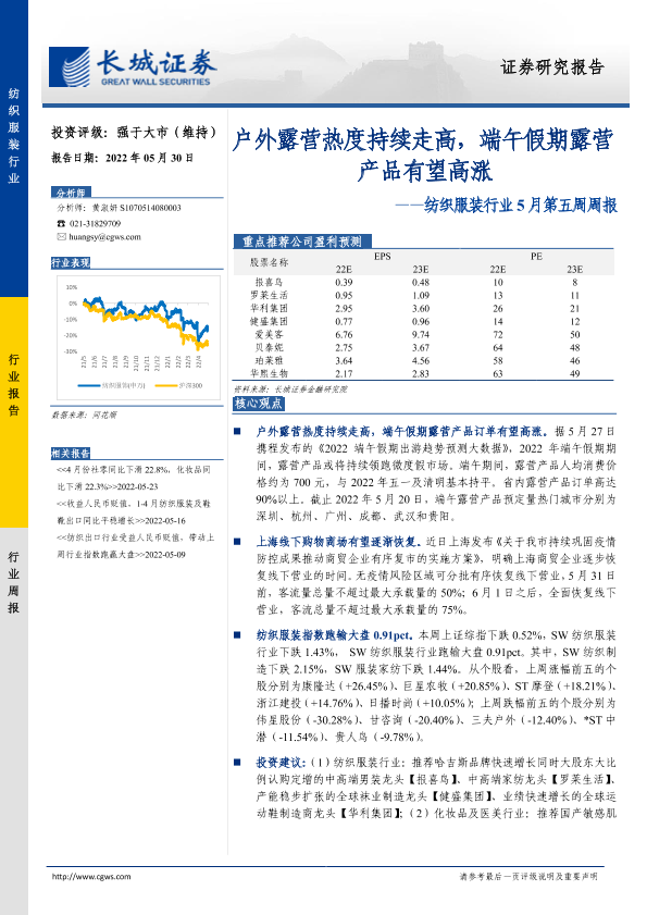 【长城证券】【20220530】20220530-长城证券-纺织服装行业5月第五周周报:户外露营热度持续走高,端午假期露营产品有望高涨-14页