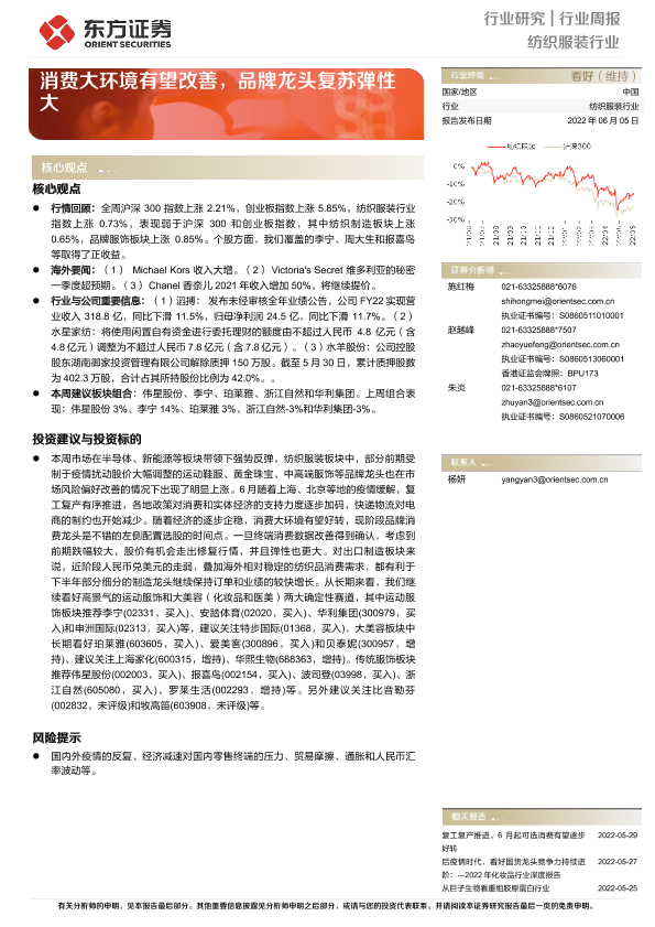 【东方证券】【20220605】20220605-东方证券-纺织服装行业周报:消费大环境有望改善,品牌龙头复苏弹性大-5页