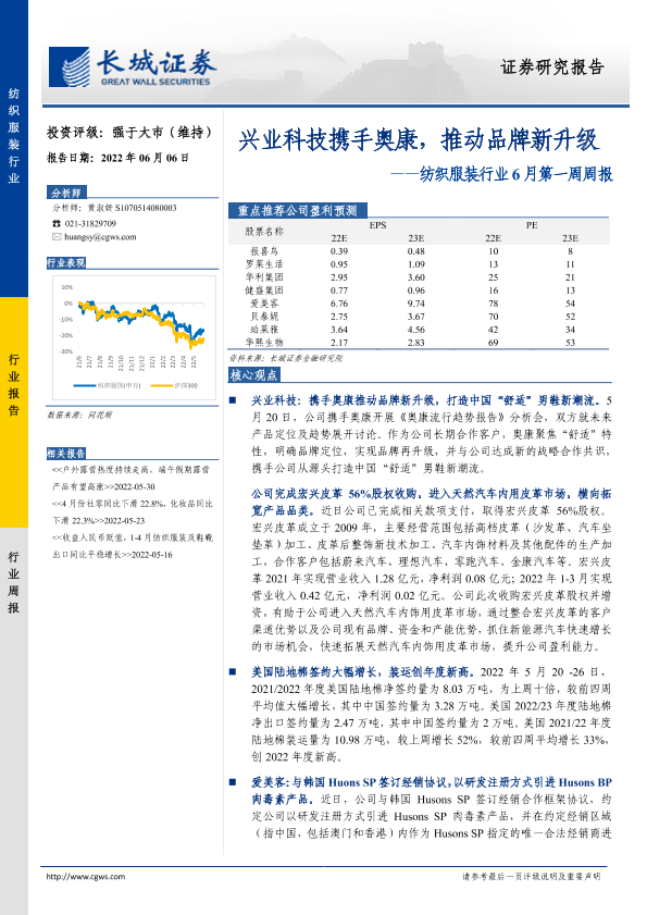【长城证券】【20220606】20220606-长城证券-纺织服装行业6月第一周周报:兴业科技携手奥康,推动品牌新升级-13页