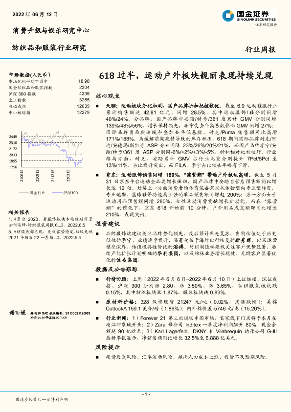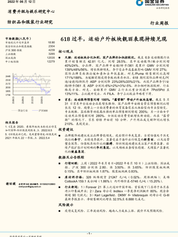 【国金证券】【20220612】20220612-国金证券-纺织品和服装行业研究:618过半,运动户外板块靓丽表现持续兑现-15页