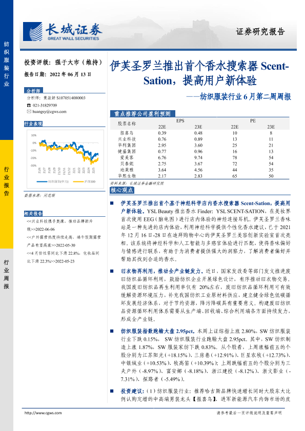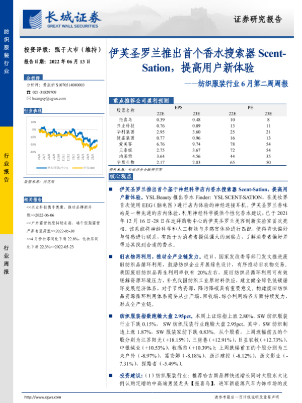 【长城证券】【20220613】20220613-长城证券-纺织服装行业6月第二周周报:伊芙圣罗兰推出首个香水搜索器Scent-Sation,提高用户新体验-12页