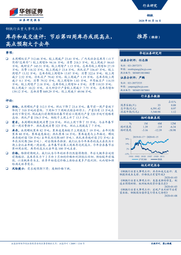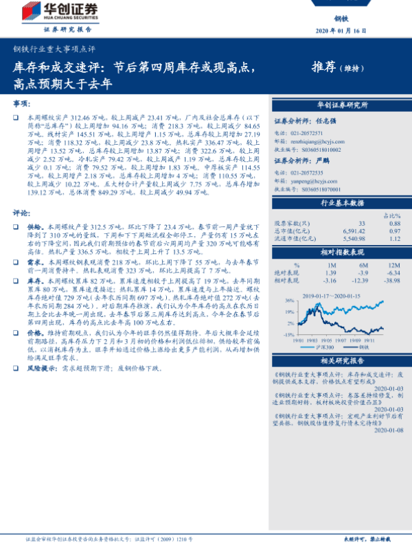【华创证券】【20200116】钢铁行业重大事项点评:库存和成交速评:节后第四周库存或现高点,高点预期大于去年-4页